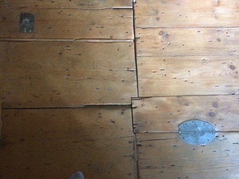 Near what was once the back porch, the top floorboard is worn completely through from generations of people wiping their boots before entering — the Prophet Joseph and Emma, Hyrum, Sidney Rigdon, Joseph and Lucy Mack Smith, Oliver Cowdery, and the Knight family all walked on this spot.